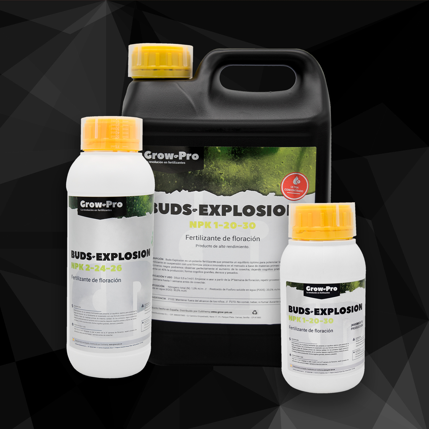Buds-Explosion es un potente fertilizante que presenta un equilibrio óptimo para potenciar la etapa de floración. Es un fertilizante en suspensión con una fórmula única e innovadora en el mercado a base de materias primas de máxima calidad. . En los primeros riegos podremos observar perfectamente el aumento de la cosecha, dejando cogollos prietos y llenos de resina. Aumenta un 40% la producción, forma cogollos grandes, densos y pesados.